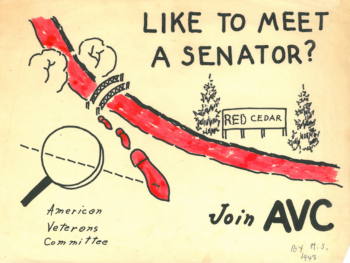 A political bombshell hit our campus in Spring, 1948. Republican State Senator Matthew Callahan, representing a wealthy suburban Detroit district, headed the Senate’s Un-American Activities Committee, decided to initiate a Red witch hunt at Michigan State. He had a subpoena issued to the one open Communist Party member of the student body, my friend Jim Zarichny, to appear at a hearing of his committee. The word spread like wildfire across US university campuses, possibly the first such student indictment in the post-WWII period, as an early salvo against CP influences in academia. This sent shock waves throughout our Party ranks and we began to mobilize against it. The Michigan State News gave the issue good coverage. Jimmy was assigned a pro bono attorney by the Detroit Lawyers Guild, a young man recently admitted to the bar. Campus civil liberties advocates organized in his support. Jimmy was an AVC member and our chapter joined in the campaign with press releases and other support. As publicity chair of the campus AVC chapter I drew two satirical cartoons about the Callahan committee which we passed out as flyers on the campus. Instead of fear pervading our student CP ranks, our membership grew from eight or nine to two dozen as a reaction, which Callahan probably did not expect.